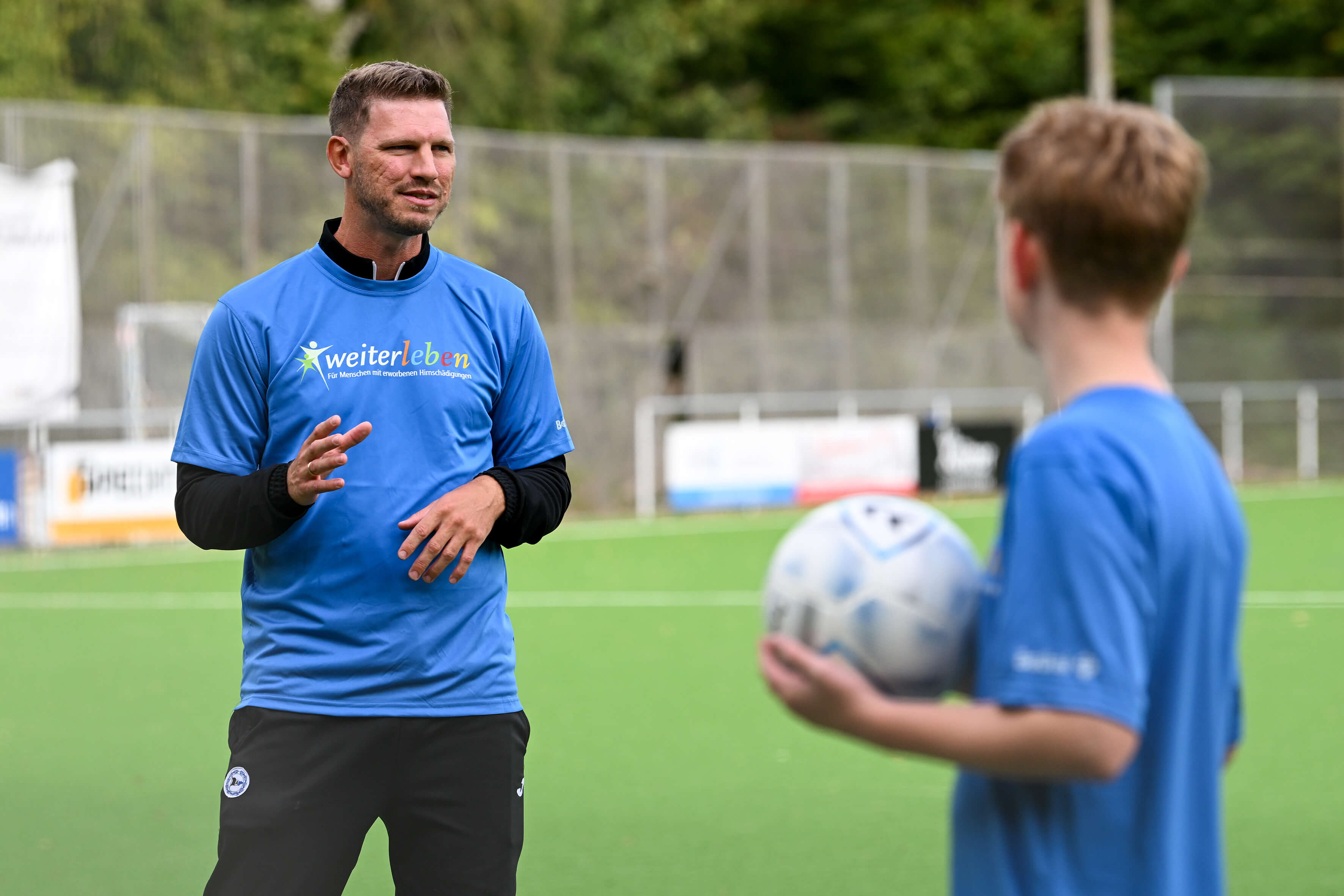 Welcher Sportler könnte glaubwürdiger für das Thema Kopfverletzungen stehen als Fabian Klos? 2013 zog er sich in einem Spiel Frakturen an Gesichtsschädel, Stirn und Augenhöhle zu; 2022 erlitt der Stürmer bei einem weiteren heftigen Zusammenprall erneut Brüche der Stirn- und Augenhöhle. Über diese schweren Unfälle spricht er auch beim Training mit den 13- bis 15-Jährigen. Selbstkritisch sagt Klos: „Die zweite Verletzung war zum Teil meine eigene Schuld. Ich war in der Situation übermotiviert, ich hätte wegbleiben müssen.“